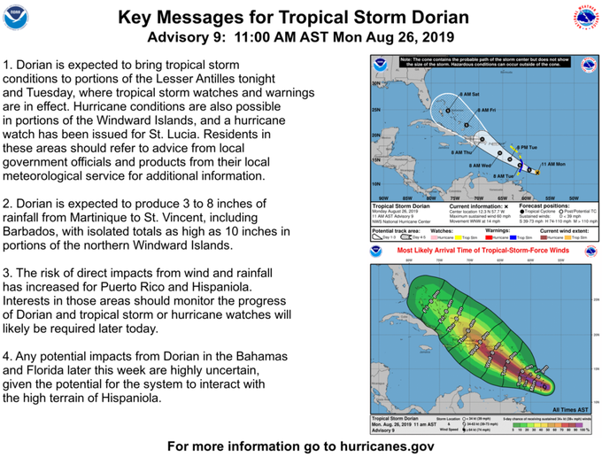 Tropical Storm #Dorian continues to move toward the Windward Islands. Here are the 11 am AST Aug 26th Key Messages. For more information visit http://hurricanes.gov